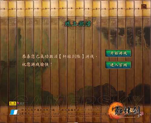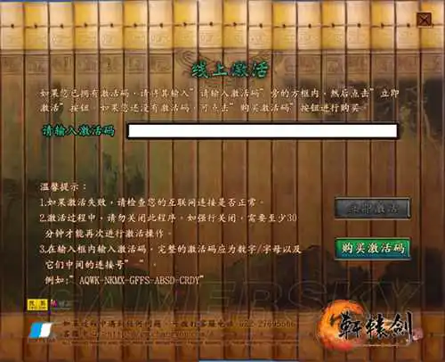 1.游戏安装完毕后,“开始游戏”后会弹出激活窗口。“购买激活码”按钮,可以进入官方商城购买《轩辕剑6》激活码。“在线激活”按钮,将进入激活流程的下一步。(注意:请仔细阅读左侧的激活说明)