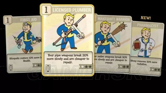 与《辐射4》不同的是,本作的辅助能力(perk系统)变成了不再是单纯的加点,变成了一种卡片的形式(perk卡)。