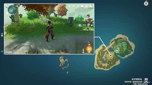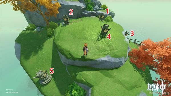 最后,我们依然保持左侧不变,将右侧盆景切换为磐固山石(即左侧为浮光山石,右侧为优悠山石),之后来到图示位置的山顶,可以看到这里有5个岩元素方碑。