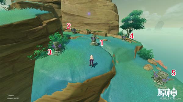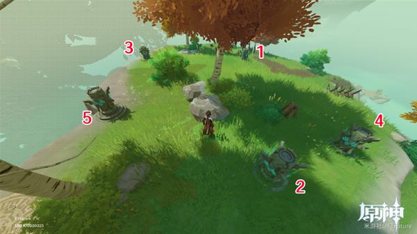和前面一样,观察此时左边浮光山石岛上的雷灵移动轨迹,最终点亮顺序如下: