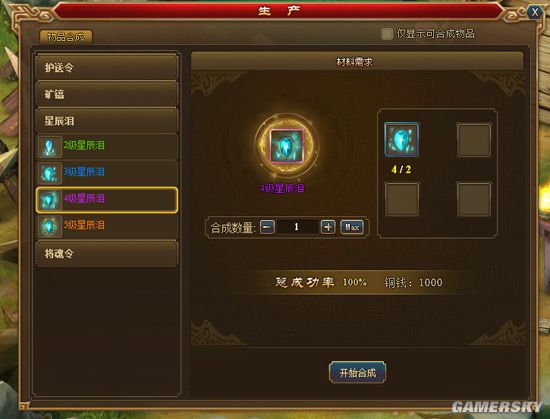 打开生产,在这里,可以对护送令、矿镐、星辰泪、将魂令四种物品进行合成,两个低级护送令合成一个中级护送令,两个中级护送令合成一个高级护送令……以此类推,矿镐、星辰泪以及将魂令也一样,每次合成需要消耗1000银币。