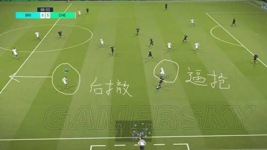 光标控制CMF(坎特)主动后撤,让边锋在前面逼抢,延缓对面进攻节奏。