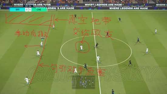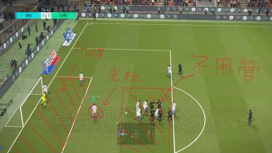 好好体会这张图。光标控制中后卫后撤,让电脑自己控制前腰压迫持球队员。边路放空,勾引电脑传边路。本作AI的跑位极其风骚,如果你不控制中后卫后撤,那么他的边锋会斜插到中路,威胁更大。