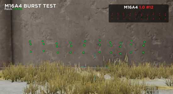 首先是M16A4的点射弹道测试。在点射模式下,M16A4每次扣动扳机将一次性射出3枚发弹。先来看看第12轮补丁也就是改动前这把武器的表现: