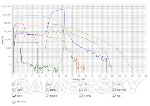 矿石和沙砾(未显示)通常在岩层固定的层数范围内成堆生成,越靠近其层数范围的边界,其生成数量渐渐减少。这是煤矿石和铁矿石在40~60层中变化规律相同的原因。