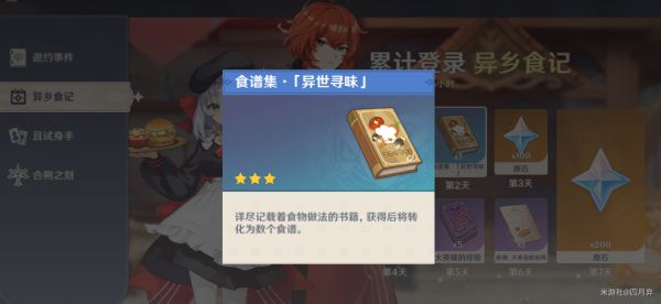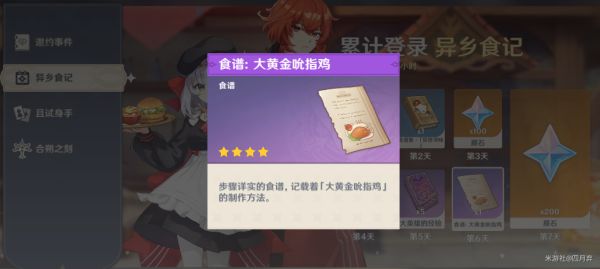 《原神》1.4版增加了几个新的食谱,有些需要自行购买获得,有些需要通过签到来获得。下面请看由“四月弃”带来的《原神》1.4版新增食谱获取教程,希望对大家有用。