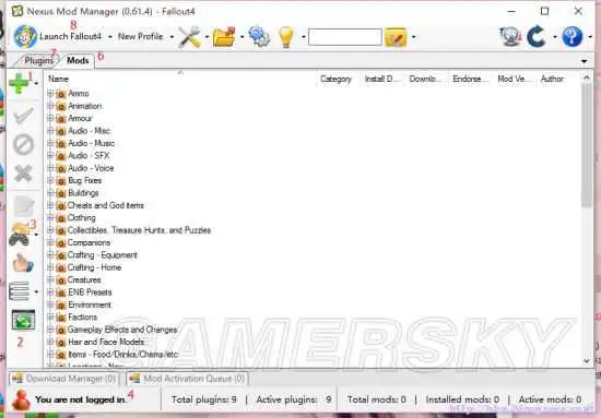从图中可以看到NMM在自动搜索支持的游戏,并且已经搜索到辐射4,当然没搜索到也不要急可以自己添加,搜索到后辐射4下方的 绿色对勾,然后第二个箭头的指向来取消扫描,然后OK,NMM会跳转到以下页面(如果只选择了一个游戏就没有以下画面)