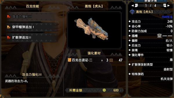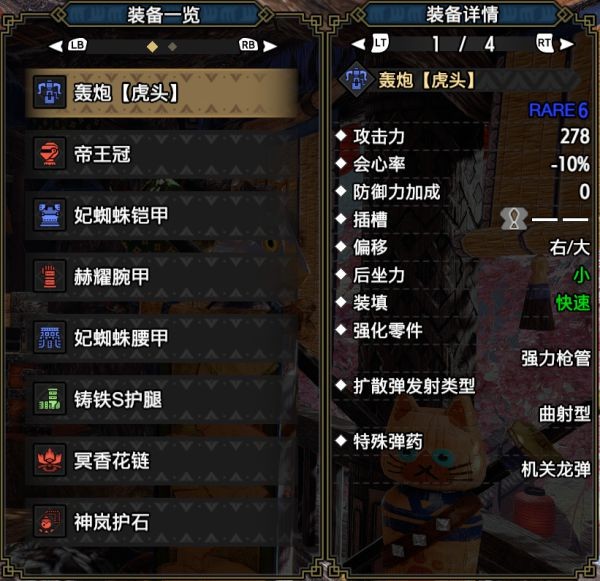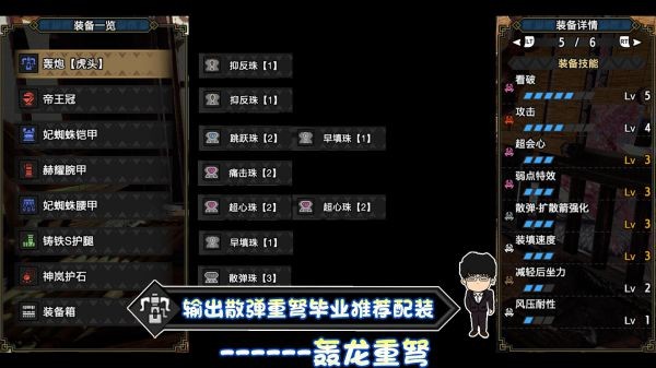 散弹1/2:有S3插槽的推荐下,手换天彗手,腰换蛮颚龙,可以更进一步提高伤害收益,同时多余的S2插槽优先弱点特效满,再是攻击伤害提升
