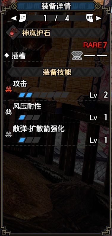 技能:看破5,攻击4(2点护石),超会心3,弱点特效3,散弹3(1点护石),装填速度3,减轻后坐力2,风压耐性1(护石),回避距离提升1,龙气活性1