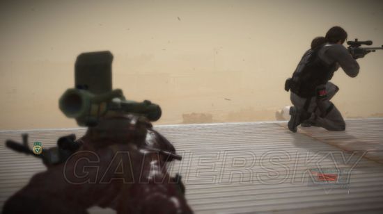 开场的时候马上往前冲,冲到铁皮屋后方的楼梯爬到铁皮屋屋顶