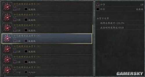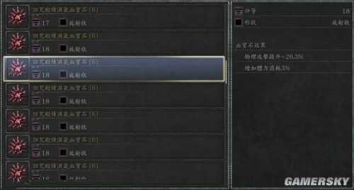 血宝石推荐用诅咒开头的血宝石,这类宝石普遍是增加1至2项属性减一项属性【同评等诅咒前缀的宝石属性要比其他前缀高出一部分,大概是有副作用的关系】,比如【+20.3%物理攻击与+3生命持续恢复为正面属性,-10.9%对怪物伤害为负面属性】。这三项为随机的,正面属性越多越好,负面属性看具体减少的是哪一项,推荐只留增加体力消耗和武器耐久度的负面属性,前者体力消耗并不算特别明显,并无总是要修理的问题,后者是推迷宫最实用的一项,因为每打完一层回猎人梦境补给基本是必须的,正好回来修理一下武器,并无太大弊病,简直可以说是毫无副作用。其他的负面属性,比如减少攻击和对XX类敌人的伤害这类是坚决不能留的,每秒持续减少生命这种慢性自杀式的宝石续航性也成问题。