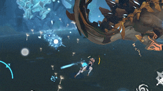 技能描述:在若陀龙王的头顶出现一个巨大的冰球,冰球每隔一段时间发射几个会跟踪的冰棱,朝着旅行者的方向射去~