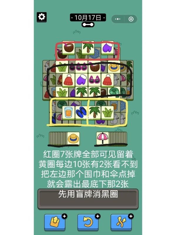 黄圈每边10张有2张看不到,把左边那个围巾和伞点掉就会露出最底下那2张,先用盲牌消黑圈。