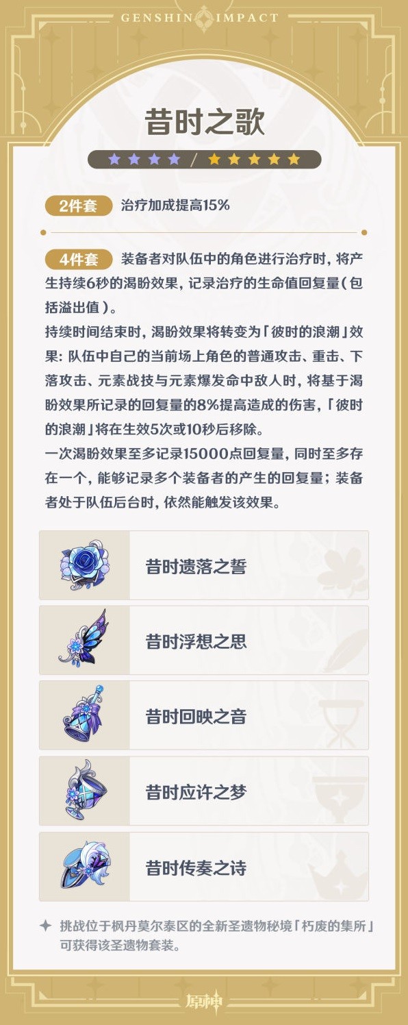 《原神》4.3版本将会推出回声之林夜话以及昔时之歌两件新圣遗物,具体属性如下图所示。