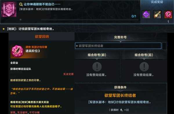 冒险家在完成地狱难度欲望军团长副本的首次通过后,将获得军团讨伐印章【欲望回响】,该奖励将通过成就系统发放,冒险家在完成首通地狱难度的相应成就后,将获得军团长讨伐印章和称号,奖励将发放至综合保管箱内。