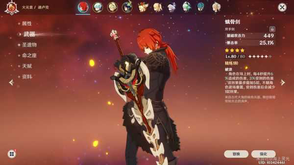 武器方面的话,迪卢克的毕业武器为狼的末路,其次是天空之傲,四星中,首选螭骨剑,其次是试做古华,在武器这里,天空之傲的技能百分之八十伤害吃的是物理加成,不是攻击力加成,且副词条为充能,后期会尤为乏力,而狼的末路是一把纯攻击的武器,在后期圣遗物后三位主攻其他方向的时候,攻击力可以用狼的末路来补全,溢出并不大。而螭骨剑的优势就是暴击率的副词条,90级迪卢克自带24.2%的暴击,虽然比别的英雄高出不少,但是在合格的暴击率面前依旧很少,此时螭骨剑的暴击副词条就是极为优异的选择,而螭骨剑技能自带的debuff其实影响甚微,在深渊十二层恶劣的环境依旧可以保持稳定三到四层buff的,且如果说是在大世界,螭骨剑的加伤吃不到也并不影响游戏体验,而且打大世界的boss也是石板地,并不是草地,不会影响自身叠buff。