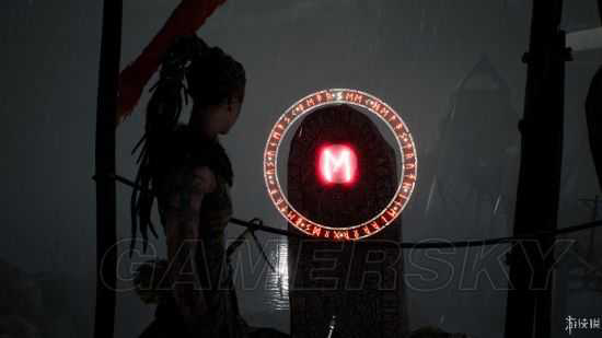 经过漫长的开场后,终于上岸了,看到一块石碑,对着它按住聚焦键会听到一段对话,告诉你要前往黑尔海姆。之后场景中看到的石碑都可以用聚焦听到一些内容,可能与游戏相关,可能与北欧神话相关。游戏中的收集要素就是这种传说之石,圆圈上的每一个红色符号代表一个传说之石, 你收集到的符号会从红色变成蓝白色,不同的区域的传说之石被一个·分开,两个·内的有几个符号就说明这块区域有几块传说之石。