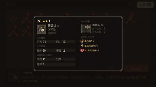 1、最开局白给的功法推荐不练,鉴于内力会影响攻防效果的设定,建议除了基本的铁琴功(群攻)和错杂弹(单体高伤)还有功能性(加内伤、降内力等)各练一个之外,其它的全部练心法以求堆高内力。根骨、天赋点是有限的,尽可能不要去用天赋点加根骨。但是如果前期过渡十分困难的话可以练个黑狗掏裆或者其它基本功法过渡。尽量借助装备等外力渡过前期。
