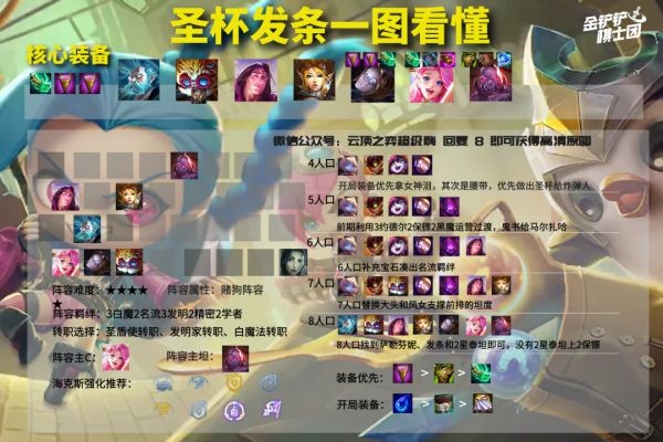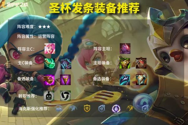 装备裂解:本阵容最少需要3个女神泪,分别是萨勒芬妮的青龙刀和发条的双圣杯,如果有多余的女神泪还可以给发条做出青龙刀或者电刀打启动用。