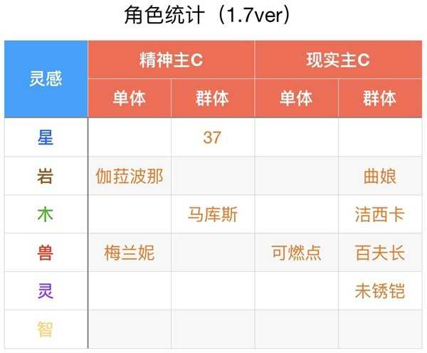 单体/群体以仪式类型为主要划分标准,例如马库斯目前虽为木C对单天花板,但仪式本质上为对群,故分入对群赛道,其他角色同理。(例外:37,主要输出在追击机制)