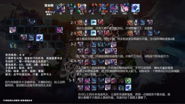 赌剑圣因为版本法师、六重的减少,在强力前排不多的版本,暗星和狙神的前排在他面前就像一张纸,而且特别克制机甲、斗士,如果再有剑转,极度克制版本的大多数阵容,基本上是版本的最强赌狗阵容。