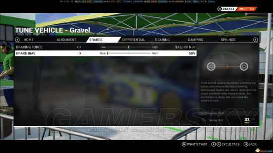 将BRAKE BIAS 向前调一格,或者2格(目的是让车子转向过头)。