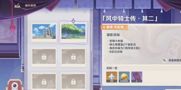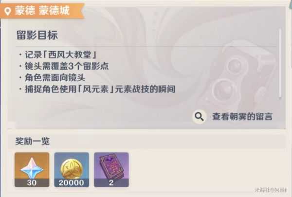 4、除了在指定地点进行留影外,朝雾委托中还包括特定的「留影目标」,根据所给的目标,玩家需要调整镜头角度 使用角色 时间等条件,以满足这些目标。当画面同时满足所有「留影目标」时,玩家们可以使用「留影机」进行记录。在每个「留影地点」首次成功留影后,可前往活动界面领取奖励。