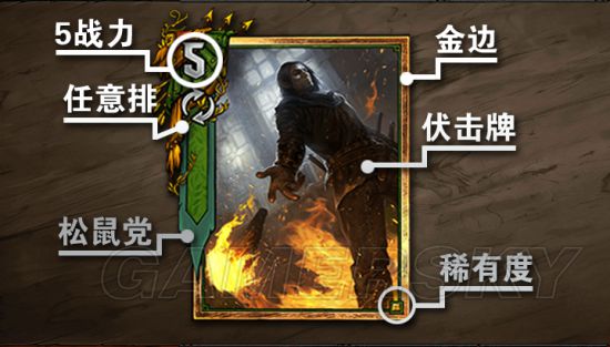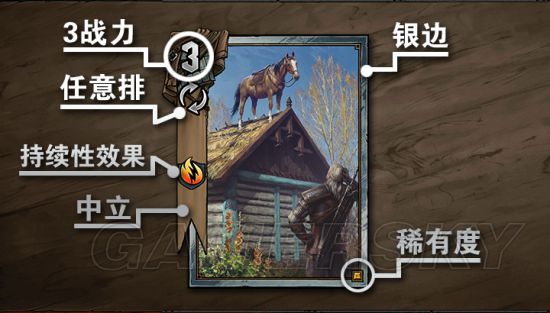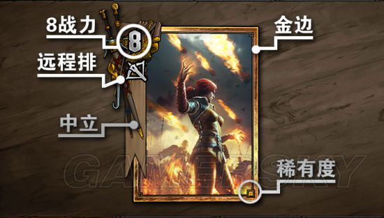 看边框颜色辨认出这是张银卡,稀有度显示在卡牌右下方的小方框中,左上第二个图标“圈状图案”指可以放置在任意排。左边的布条颜色表示这张卡是中立卡。左边第三个图标,也就是那团红色的小火焰表示,这张牌有持续性效果。