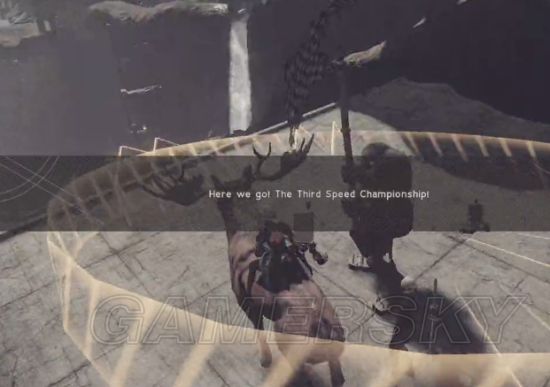 然后慢慢按对话同时推摇杆\键盘控制2B前进的按钮慢慢蹭到鹿的左后腿知道可以显示可以骑上去的那个按钮,然后等到选项再比一次按下去的时候,频幕会慢慢变黑拉你去起点的这一瞬间,前推摇杆\按着2B前进的键狂按骑动物的那个按钮,然后出现下面的图画面: