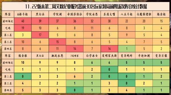 本周共统计对局600场,涵盖了29套阵容,去重后共进入前四场次353场对局,吃鸡场次91场,(还有11套阵容前四场次不足5场没放到表格内)。