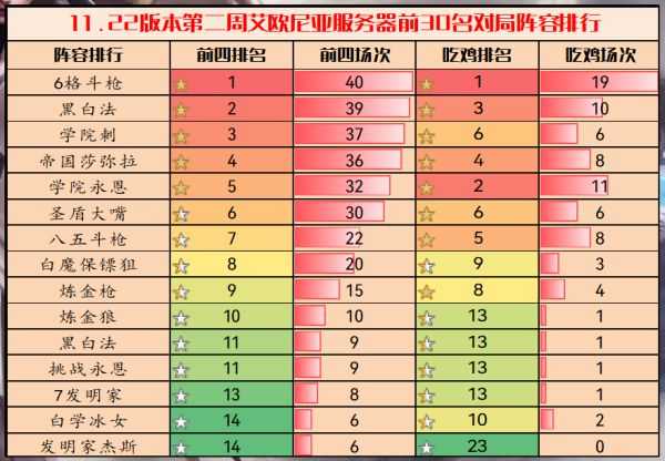 阵容吃分前三强为:6格斗枪、黑白法与学院刺,吃鸡场次前三强是6格斗枪、学院永恩与黑白法。