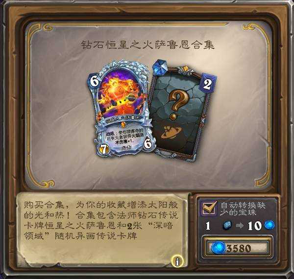 合集包含法师钻石传说卡牌恒星之火萨鲁恩和2张“深暗领域”随机异画传说卡牌。