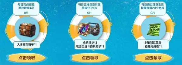 每日完成活动任务后,即可在活动页领取大洋硬币箱子、永劫精华、攻击型战斗道具箱子以及[每日]艾芙娜委托完成卷实用道具,奖励每天都可以领取,冒险家们千万别错过哦~