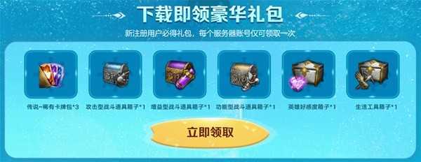 我们还在活动中为新来的冒险家准备了专属大礼包!只要注册并创建角色即可领取,包括各种实用的道具箱子和卡牌包,已经领取过的用户无法重复领取。