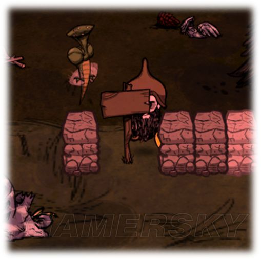 像这样造石墙和木牌,看到没,木牌有两个石墙宽,而且可以卡住不让你进来。围个四方的墙壁,每个面都保证有一个豁口儿造木牌。你得先造木牌,木牌建造需要空间,造好木牌,再堆石墙。