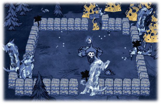满月的时候,会有一道能量给你的唤星者权杖充能,但是在充能的过程中,会不断生成疯猪和猎狗过来袭击你。而之前月石化的生物会从月石状态变回肉身,我留下的一只猎狗是死翘翘的状态,所以它刚变回肉身就变成一坨怪物肉了(你可以通过观察月石生物的外观来判断它们是死是活,做攻击姿态的是活的,四脚朝天的是死的)。我来解释一下,因为石墙有豁口儿,所以这些生物会优先从豁口儿处进来,它们会攻击石墙,如果你围满了墙,那么你很快就会面临墙破人亡的窘境了。但是这些生物不会拆建筑,我听我的小伙伴“何必”说,他看过一个人造满了茶几来抵御猎犬,虽然有想法,但挺ZZ。这个法儿老司机都会用,我们饥荒达人挑战赛的时候,用这个办法一个人单刷访月者权杖。