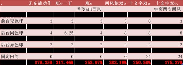 第三列如果香菱a出的西风球自己吃到,或者第四列班尼特多打一个e,则充能降到230%充能左右。绝缘2+西风枪+充能沙+6条充能可以满足,即100+20+30.6+51.8+6*5.5=235.4%。