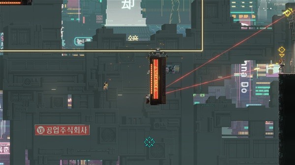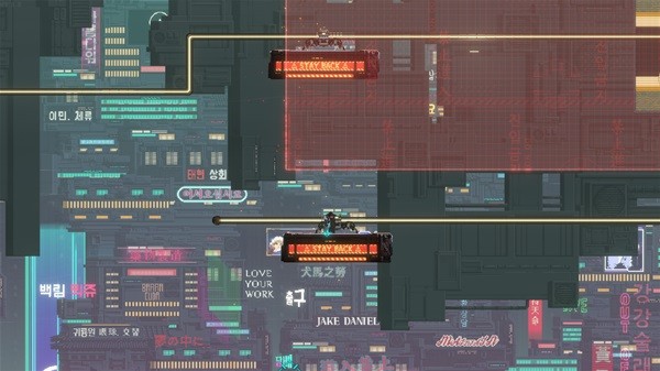 游戏从区域上划分大概可以分为下城区、商业区、工厂、麻古总部,第一个片区下城区的难度还算是相当的友好,不过第二个片区商业区就从区域和平台上都出现了很多新的难点——区域上出现了大片的红色区域,一旦进入就会被射击,平台上出现了大量临时轨道平台,玩家需要搭载这个平台并且灵活翻转于上下左右等各个位置,才能避开红色区域,最终抵达目的地。