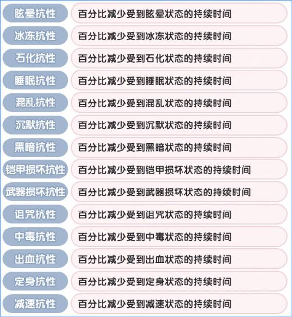 提升对于特定属性或者技能抗性的词条,减少受到对应debuff效果影响的时间。