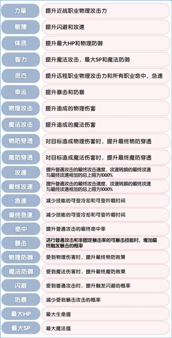 基础属性在游戏中可以通过人物加点或者穿戴装备等方式获得,提供的效果较为基础,属于部分职业可通用的属性。