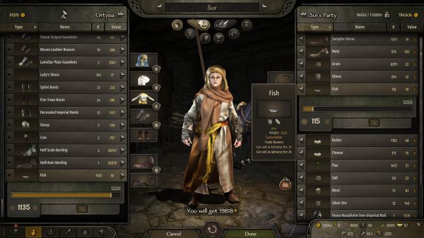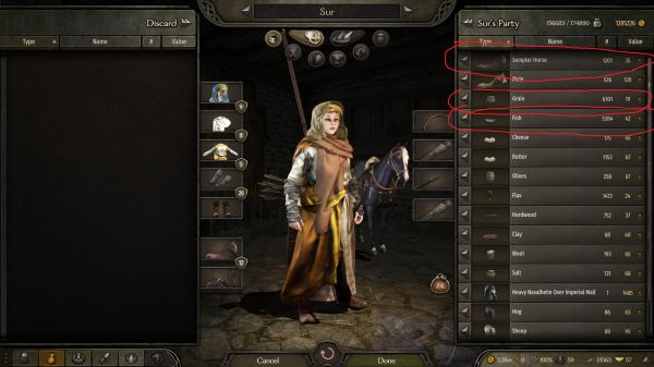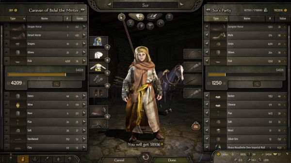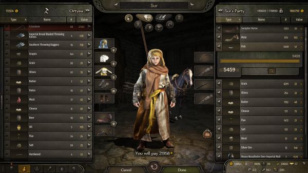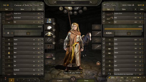 首先,这代不再需要物品管理来提供格子了,变成了负重,而负重依靠的是各种马,开始我其实没有注意,直到我发现自己的速度只有3+以后才发现这代有了个herd惩罚,也就是说你的牧畜越多你的移动速度就越慢,也就是说tactias变相的也增加了我们的现金流,不再单单是依靠一个trade了,而这也使得商人的30%负重变得更加重要。我们不论做什么选择,第一重要的还是运力,所以我们要买马,尽可能购买低价sampter house,资金不足的情况下选择性的购买mulu,170以下的其实都可以购买因为有Ostican这个地点大概能以2倍的价格出掉所以不用担心资金固化。同时由于改为了负重系统,这使得你能买卖的所有东西在一定程度上都变成了货币。这个经济系统我们可以实现在oristocorys购买的fur直接去berihal换取马匹之类的行为成为可能并且不会因为中间商赚差价而使得大部分的经济行为变得没有意义。这里有个类似作弊的方法来获取马匹,我是300天以后才发现的,使用不使用全取决于自己,你可以跟在城市卖完东西的村民以极为低廉的价格购买sampter house,不仅能提供运力,并且在Ostican这个地方一样能获利2倍以上。不使用这种方法的话各人建议是前往东边的Akkalt等地购买当地的sheep,cheese,butter。当然你也可以选择直接刷Loots或者刷冠军,性质一样的,就是为了所谓的第一桶金。