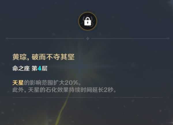 还有钟离的命之座四层会提高天星的影响范围,重点是延迟2秒的持续时间,这对天星的控制效果提升是非常明显的,几乎翻了一倍。要知道单人模式下,你钟离放完大招后会有一秒左右的硬直,所以实际你在控怪输出的时长可能也就2秒左右,而额外增加两秒相当于延长了一倍的输出时间。