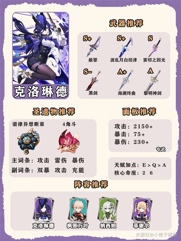 《原神》中克洛琳徳是一名雷属性单手剑输出型角色,那么克洛琳徳出装与配队要怎么搭配呢?下面请看由“小橙子猪弟 ”为大家带来的《原神》4.7克洛琳徳出装与配队一图流,含幽光星星采集路线分享,希望大家喜欢。