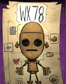 WX-78是一个人造机器人,他可以吃变质的食品,而不会造成生命或饱食度的降低。WX-78由于他是机器人,在使用齿轮后可以增加生命值和精神值,饥饿度的上限((饥饿100~200,血量100~400,精神100~300).大约吃15个零件就会达到最大值(这些数值在通过传送平台时会保留)并且他的铁皮自带4.5%的防御。