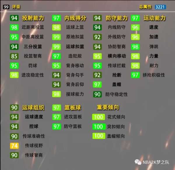 属性亮点:99站扣+99突扣+98力量+94三分