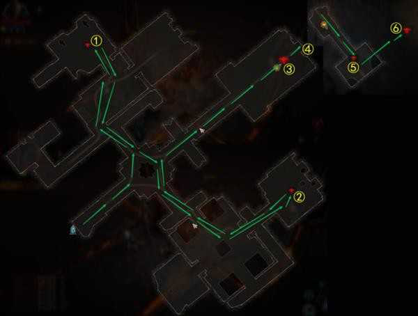 ① 击杀1号小BOSS重生十字架(重生雕像)→②击杀2号小BOSS幽暗十字架(灵魂雕像)→③击杀3号大BOSS国王法希尔(法希尔王)→④进入下一层→⑤起动升降梯,击杀4号小BOSS巨大破墓兽→⑥击杀5号大BOSS雷吉西斯(赛吉西斯),结束副本