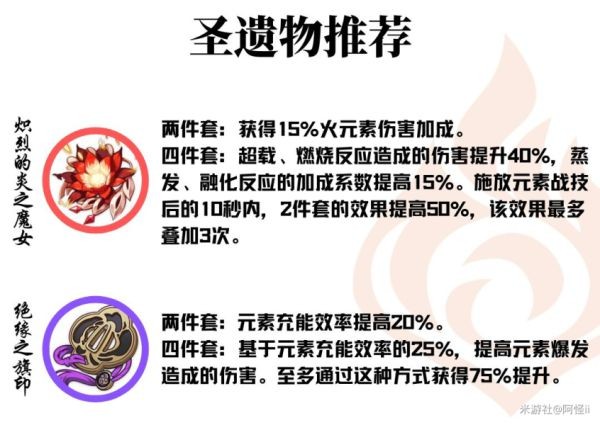推荐主属性使用充能沙、火伤杯、暴击/爆伤帽子,副属性双暴>充能效率>精通>攻击力