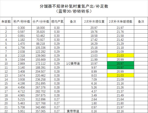 所以说,如果每22塔1补,那么每22塔,就有约357/m的补氢输入和重氢输出(略小于360/m);每44塔,有就714/m补氢输入和重氢输出(与720/m相差6/m);每110塔,就有1785/m补氢输入和重氢输出(与1800/m相差15/m)。