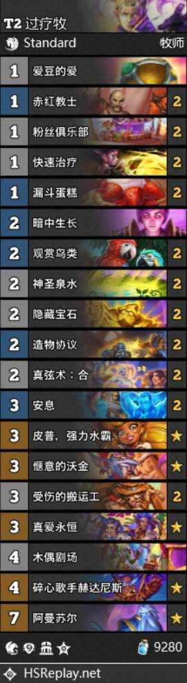 牧师的形态比较单一,在迷你包上线之前过疗牧就是天梯常客了,迷你包之后横空出世的大法术法仅需四费就能出一地水人导致过疗牧难以应对,加上这套卡组本身也是需要一点熟练度的卡组,导致这卡组在环境中不是那么的强势,不过随着时间的推移,玩家们纷纷使用针对大法术法的卡组导致大法术法的减少过疗牧的环境又好起来了,在对阵除了大法术法的对局都能做到55开甚至是小优。