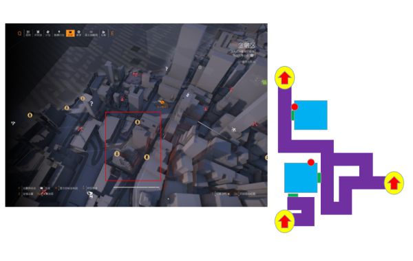 紫色条状为通道,绿色方框为连接房间与通道的门(连接处),红点为钥匙处,蓝色方块为房间,纽约地图一般钥匙都在房间内,与DC不同,DC很多都直接在通道墙上。